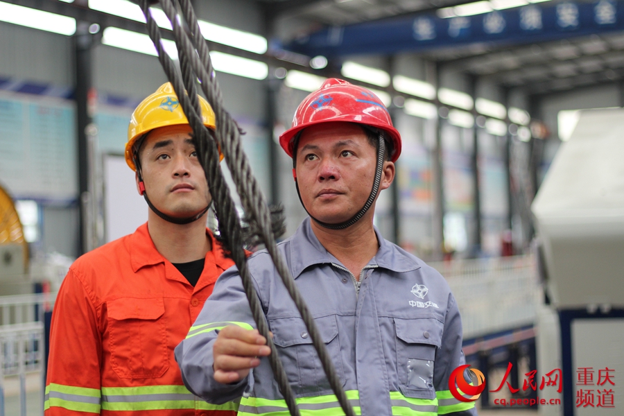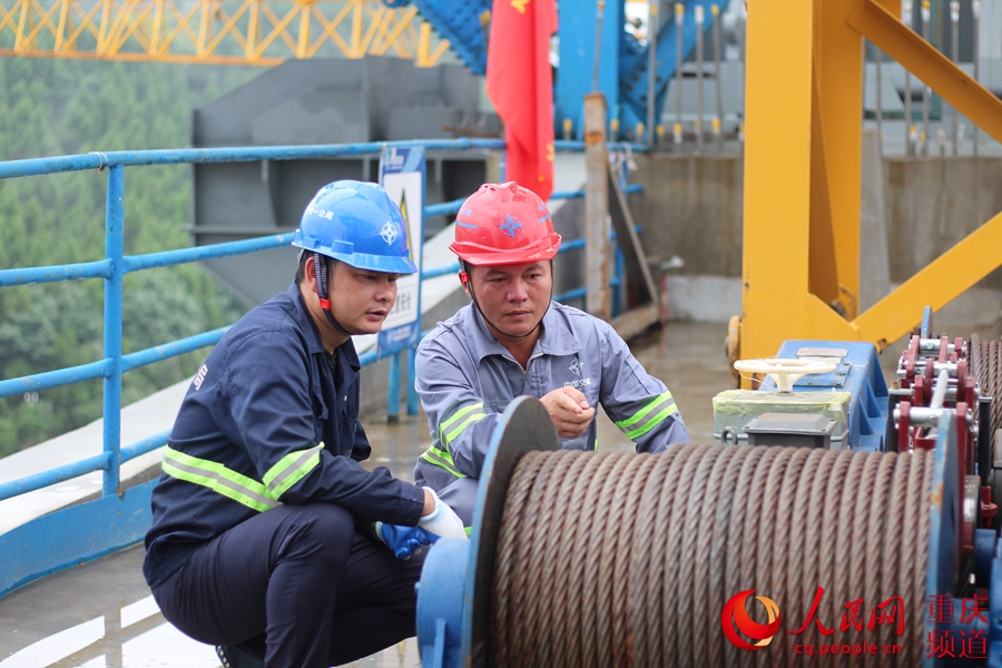 拆裝橫向支撐設(shè)備前,李廣輝與工友一同檢查卷揚(yáng)機(jī)的安全性能。中交一公局 供圖